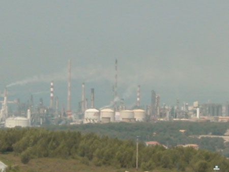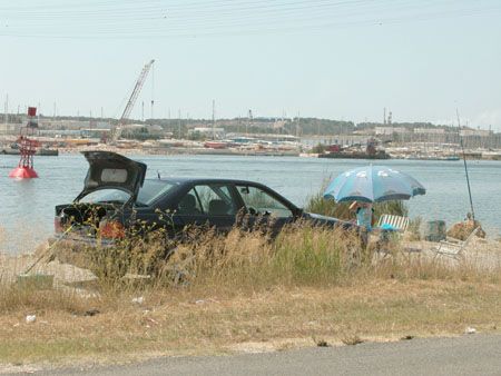 Nouvelle étape dans le grand Marseille. J'accompagne Christophe sur une campagne de photographies à Sausset-les-Pins sur la côte bleue, le type même de ces pavillonnaires proliférants qui ont été stoppés grâce à la loi Littoral (?) Christophe me fait remarquer qu'ici les gens sont surtout préoccupés de leur corps. Tout le contraire de l'oubli. Un 4*4 sonorisé circule pour proposer le magazine Top Santé. Nous ne traînons pas trop. Nous reprenons l'autoroute et décidons de pousser jusqu'à Port-de-Bouc, ville industrielle située face au port pétrolier de Lavéra à l'entrée de l'étang de Berre. Toute la zone depuis Martigues baigne dans une odeur très forte de pétrochimie. On a l'impression qu'il suffirait de gratter une allumette pour que tout explose.