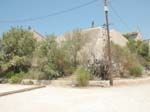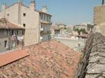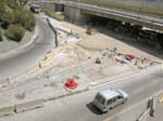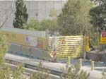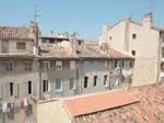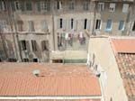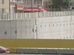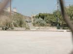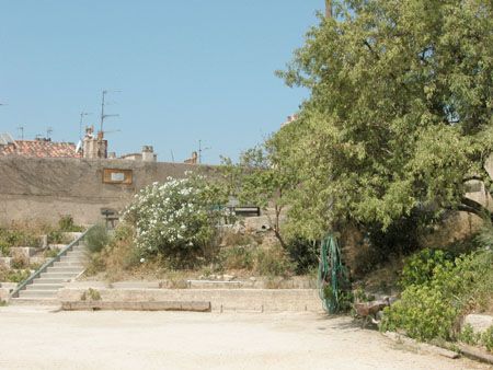 Je redescends Porte d'Aix et m'engage sur la bande d'arrêt d'urgence de l'A7. Je veux faire le tour de cet îlot délimité par l'avenue Camille Pelletan, l'autoroute, et l'avenue du Général Leclerc que surplombe à cet endroit la rue des Treize Escaliers. Je monte sur le talus qui borde l'autoroute et découvre derrière un grillage le terrain de boule de l'Arc de Triomphe aperçu depuis la rue des Treize Escaliers le 4 juillet dernier. Je longe le grillage puis me retrouve devant l'entrée fermée. Il y a un trou à côté de la porte où j'hésite à me glisser. Je descends la rue et j'enregistre des images du chantier titanesque de l'avenue du général Leclerc en contre-bas. Finalement je fais machine arrière et me glisse dans le passage. Au fond du terrain, lovée derrière des arbres, je découvre une petite cabane qu'une tonnelle protége du soleil. Des hommes s'affairent autour d'une popote. Ils me proposent de déjeuner et me conseillent de revenir discuter avec le président du groupe bouliste qui sera là cet après-midi. J'hésite un peu. Je monte sur un banc pour enregistrer des images de l'arrière des bâtiments de l'avenue Camille Pelletan cachés par le muret du terrain de boule. De ce côté les fenêtres ne sont pas murées, il y a du linge qui pend.